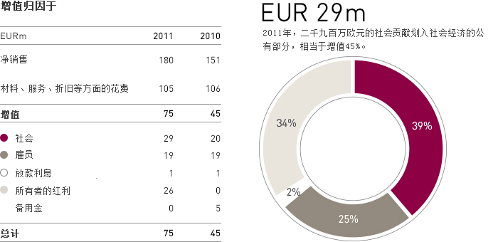 根據(jù)阿爾博波特蘭對(duì)丹麥社會(huì)做出的貢獻(xiàn),2011年的增值達(dá)到七千五百萬(wàn)歐元。其中,二千五百萬(wàn)歐元(39%)以增值稅、征稅、公司稅和個(gè)人所得稅的形式劃入社會(huì)經(jīng)濟(jì)的公有部分;一千九百萬(wàn)歐元(25%)以工資和養(yǎng)老金繳款(稅后)的形式劃給了員工;由于負(fù)債已降低到了非常低的水平,2011年將有二千六百萬(wàn)歐元的紅利可供分配。自2004年集團(tuán)收購(gòu)開(kāi)始,集團(tuán)擁有者便放棄了紅利。