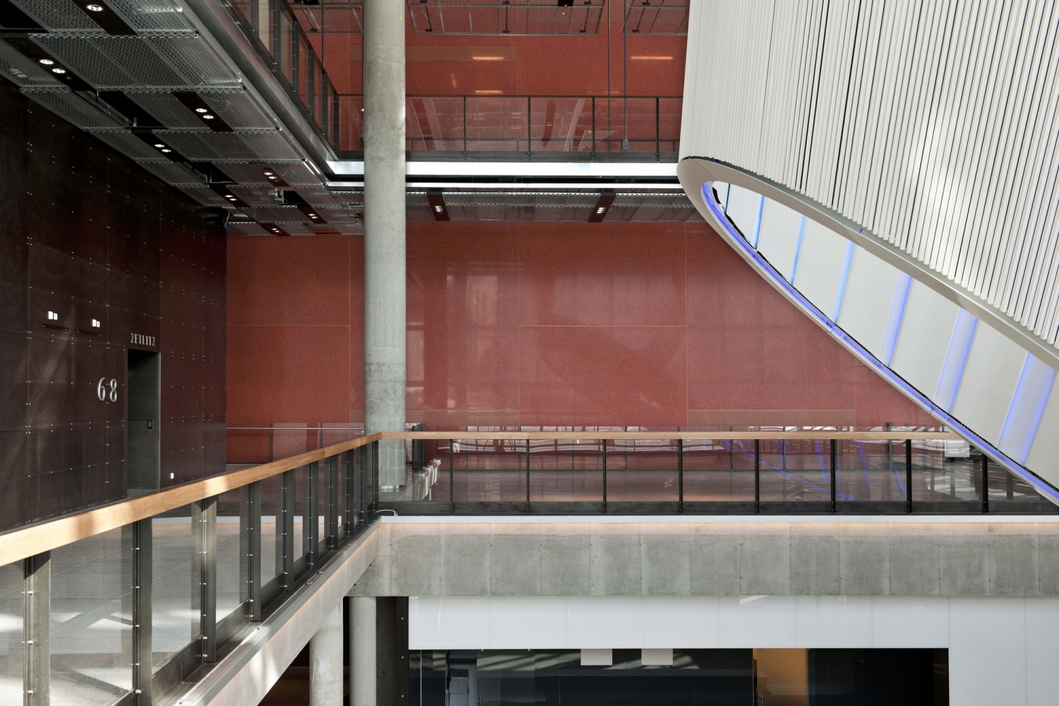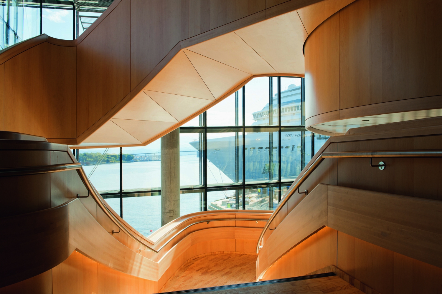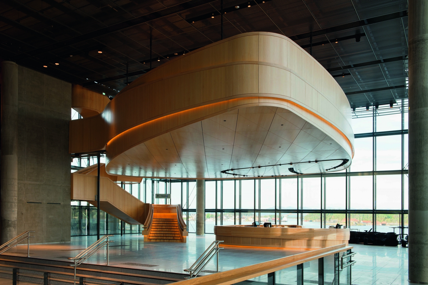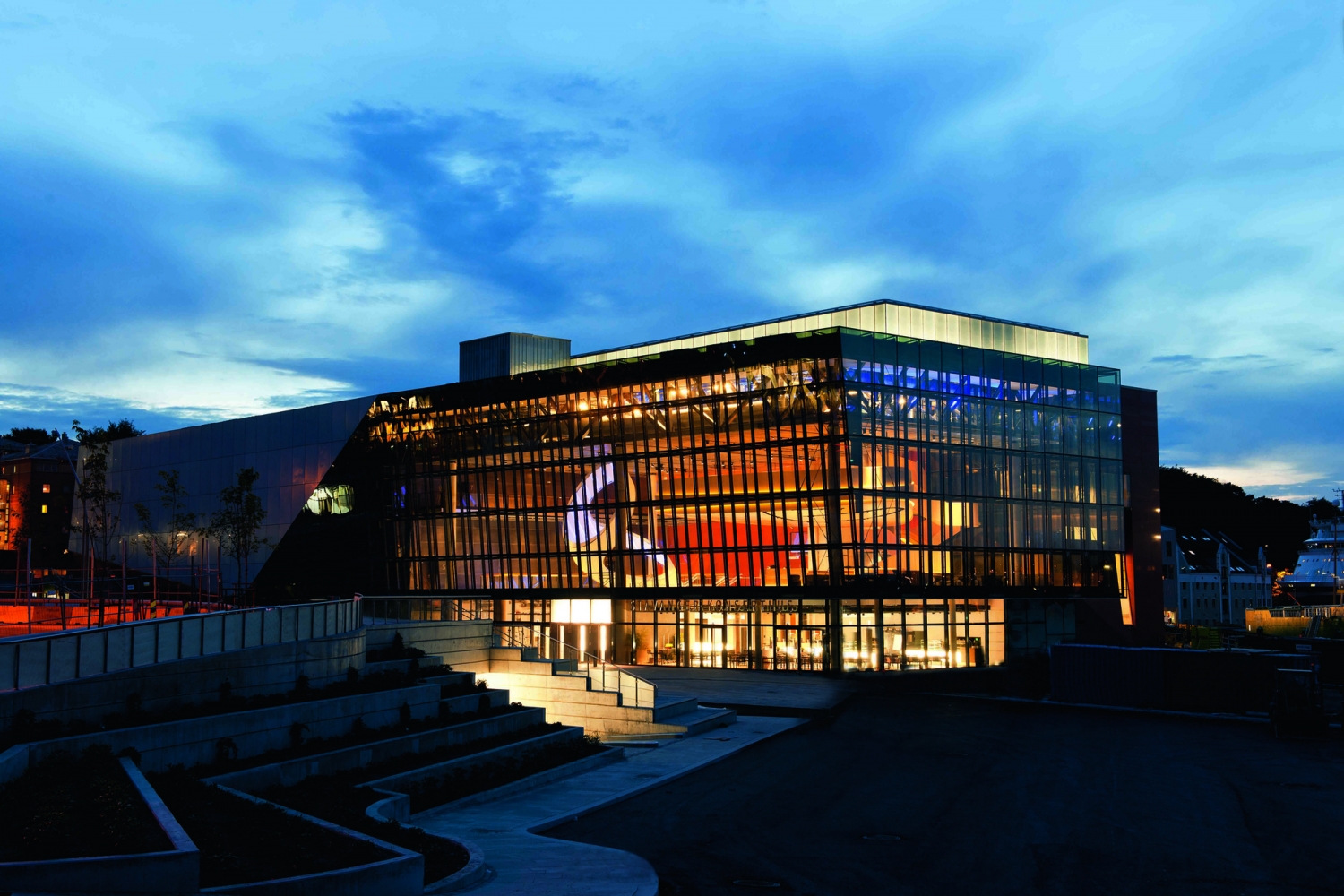 兩座禮堂并排而立:斯塔萬(wàn)格的新音樂(lè)廳由Ratio建筑事務(wù)所設(shè)計(jì),容納一個(gè)管弦樂(lè)廳、一個(gè)多功能廳、一個(gè)餐廳、一個(gè)咖啡館和給幾個(gè)酒吧。音樂(lè)廳包含兩棟由玻璃和混凝土建成的建筑。玻璃結(jié)構(gòu)是敞開(kāi)的,透明、穩(wěn)固且富有變化的。紅色的混凝土結(jié)構(gòu)是密封的,更加的精致堅(jiān)實(shí)。大樓的兩個(gè)部分分別為多功能廳和管弦樂(lè)廳,每個(gè)部分都為獨(dú)立的結(jié)構(gòu),且相互隔音。這樣可以同時(shí)在兩個(gè)演奏大廳內(nèi)進(jìn)行表演,而又不會(huì)影響各個(gè)廳內(nèi)的音響效果。
