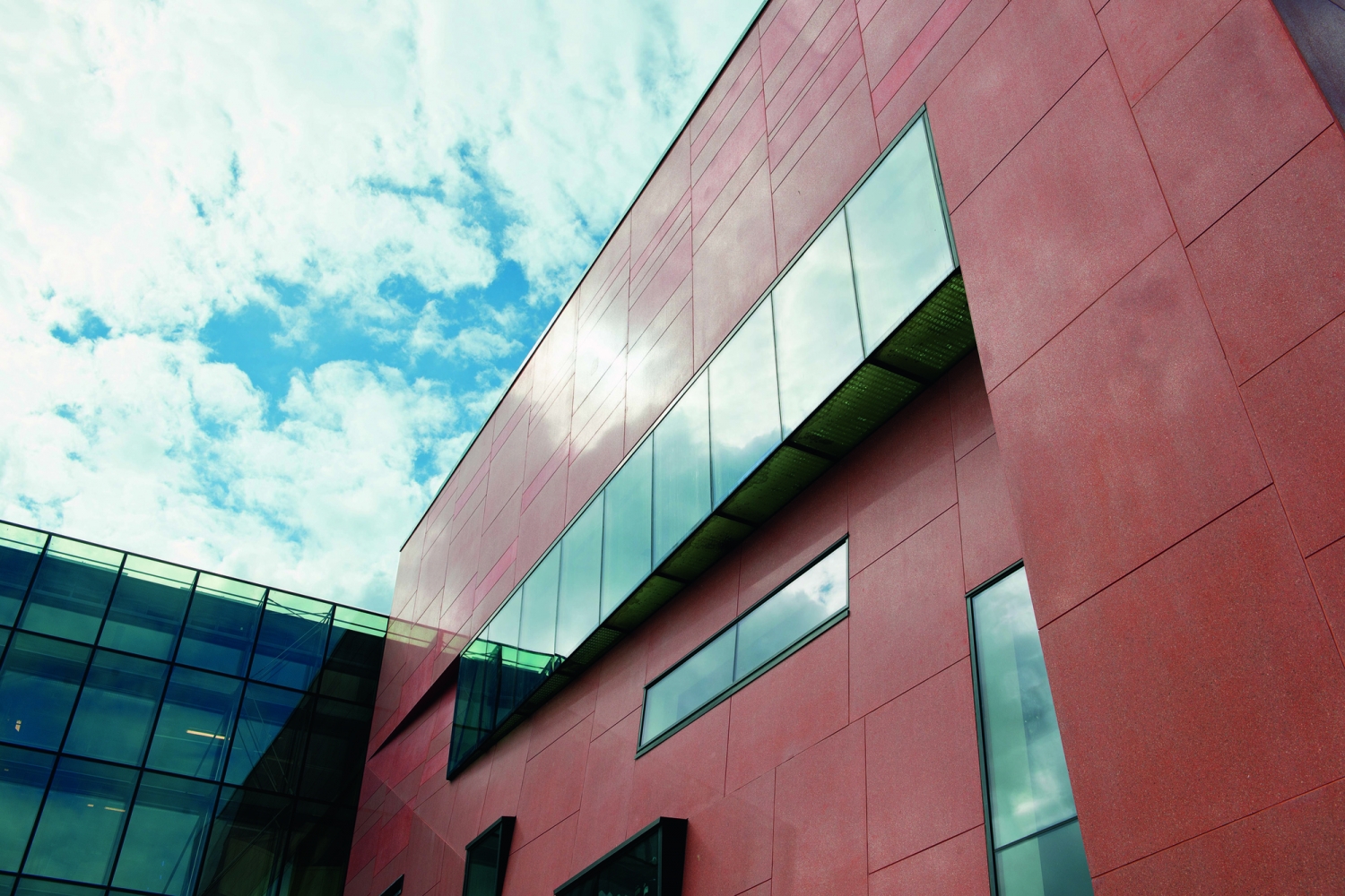 大樓的北部立面由仿花崗石質(zhì)地混凝土和仿玻璃質(zhì)地混凝土建成,面積大約為4 000平方米,由不同尺寸的375個(gè)混凝土預(yù)制構(gòu)件組成——經(jīng)過(guò)了砂紙打磨、拋光以及防水處理。構(gòu)件的重量從430公斤 – 20噸不等,使用30噸紅色玻璃和30噸透明玻璃制造。這些構(gòu)件由AS Betong生產(chǎn)和安裝,水泥則是阿爾博波特蘭生產(chǎn)的阿爾博?水泥。