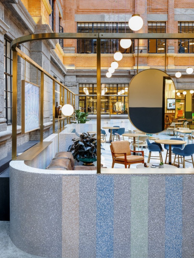 這幢位于市中心的始建于上世紀(jì)的老式磚房當(dāng)時(shí)是一座鴉片廠,之后成了一名藝術(shù)家的住所,這次再次的翻新是做了細(xì)致的考慮的,全部的設(shè)計(jì)元素都是設(shè)計(jì)師為了表達(dá)一種看似漫不經(jīng)心,卻又能為在其中辦公的人們提供最周到服務(wù)的現(xiàn)代化辦公空間而精心安排的。大廳采用阿爾博?白水泥混合多種顏料形成簡潔明快的現(xiàn)澆水磨石地面。阿爾博?白水泥作為極具表現(xiàn)力的原材料產(chǎn)品,賦予建筑師和設(shè)計(jì)師無限的靈感。