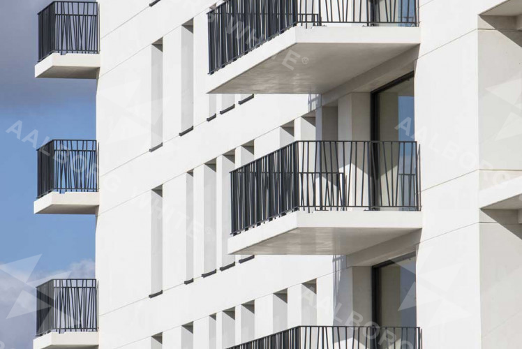 白色混凝土窗戶和幕墻是在Cordeel工廠事先預(yù)制完畢,減少了現(xiàn)場(chǎng)安裝構(gòu)件的工作量。并確保整個(gè)建筑幕墻的完整性。該公寓有著簡(jiǎn)潔的現(xiàn)代設(shè)計(jì),更加強(qiáng)調(diào)細(xì)節(jié)和質(zhì)量。建筑事務(wù)所聯(lián)合Cordeel混凝土工廠一起監(jiān)督各個(gè)方面,包括顏色、圓角細(xì)節(jié)、集成排水溝、陽臺(tái)面板和陽臺(tái)頂表面的平滑度,是高質(zhì)量住宅建設(shè)不可或缺的一部分。